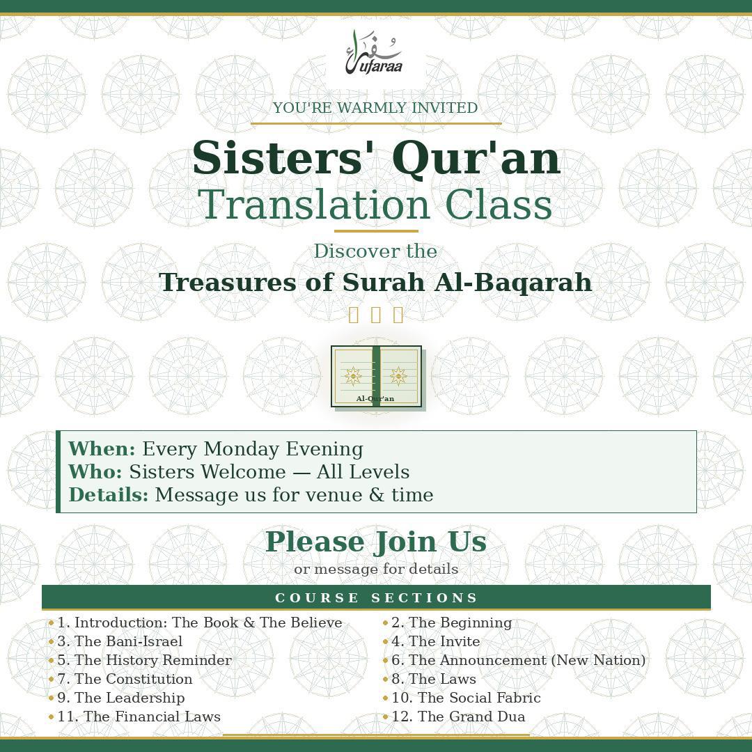 Join us for our Sisters’ Qur’an Translation Class, a journey through the guidance of the longest chapter of the Qur’an.